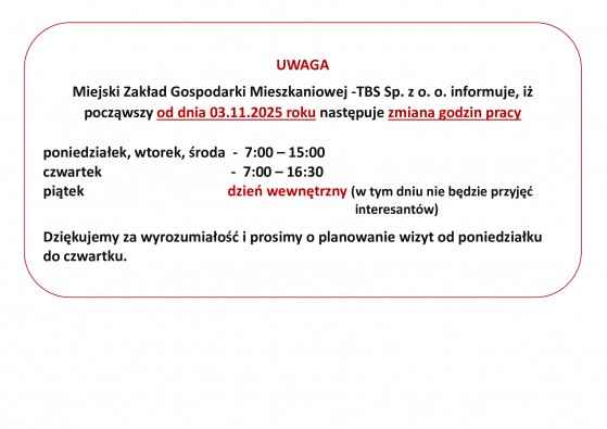 07.03.2025 | 12:17Uprzejmie informujemy, iż w dniu 07.03.2025 r. (piątek) Miejski Zakład Gospodarki Mieszkaniowej -TBS Sp. z o. o., Rejony Obsługi Mieszkańców nr 1, 2, 3 oraz Zarząd Budynków Komunalnych w Płocku będą czynne do godz. 14:00. Za powstałe utrudnienia przepraszamy.